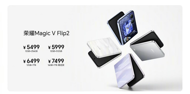 售价方面,荣耀Magic V Flip2 12GB+256GB版本售价5499元,12GB+512GB版本售价5999元,12GB+1TB版本售价6499元,高定款售价为7499元(16GB+1TB)。
