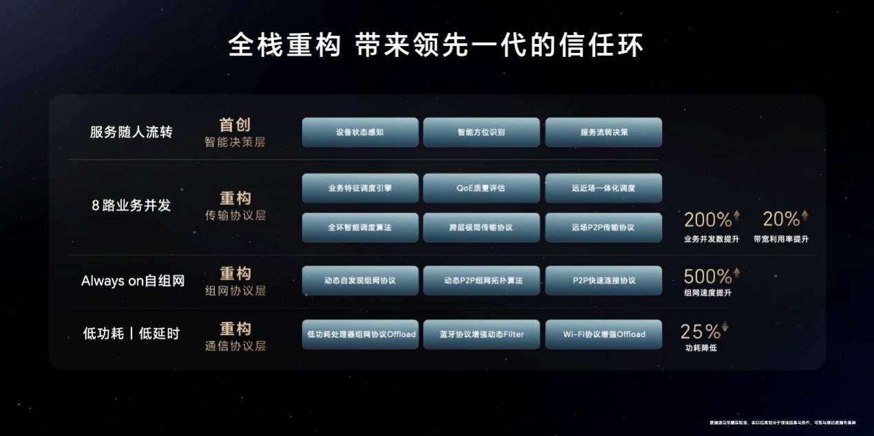 荣耀MagicBook Pro 16使用了全栈重构的领先行业一代的信任环,实现了设备发现零等待,并让功耗降低25%;利用组网协议层重构,组网速度提升500%;最后也重构了传输协议层,带来高并发/高吞吐的体验,最大支持8业务并发,带宽利用率提升20%,为用户构筑起以人为中心的智慧互联新体验。