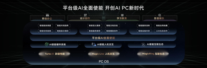 荣耀CEO赵明在发布会上表示,基于AI使能的全场景战略,以及对于荣耀AI四层架构的全面理解,荣耀通过平台级AI全方位赋能笔记本,利用AI技术重构PC产业,实现AI技术与消费者体验的融合,开启AI PC新时代,引领AI时代下的终端体验变革。