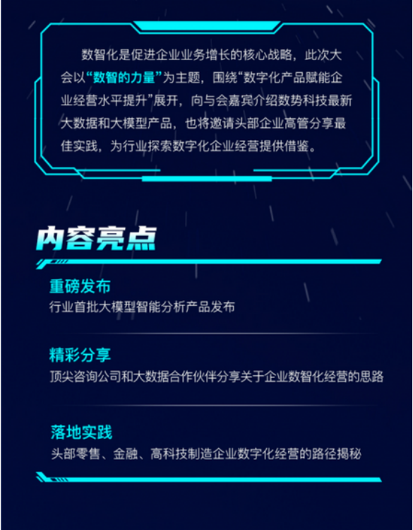 数势科技一直走在数据智能技术的前沿,本次大会将见证行业首批大模型智能分析产品的升级发布。借助最前沿的大模型技术,这些创新产品将为企业带来前所未有的深度数据分析能力和智能决策支持,助力企业在竞争激烈的市场中脱颖而出。