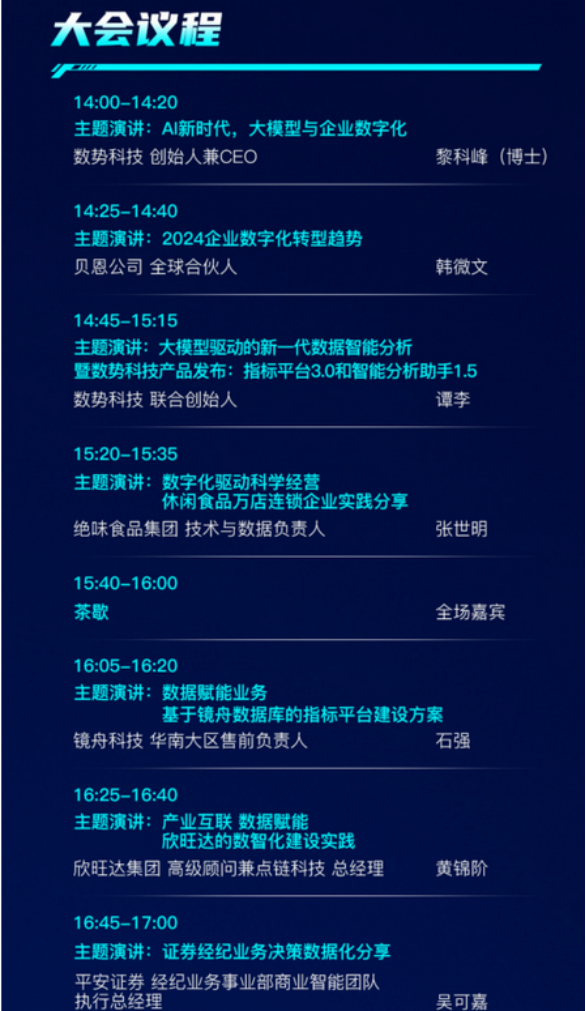 数势科技的客户大会是一次技术的路演、一次思想的碰撞、一次实践的探讨,将为企业决策者和行业专家提供一个交流的平台。无论您是对大模型技术感兴趣,还是希望了解数据智能的最新趋势和实践,本次大会都将为您提供丰富的信息和启发。