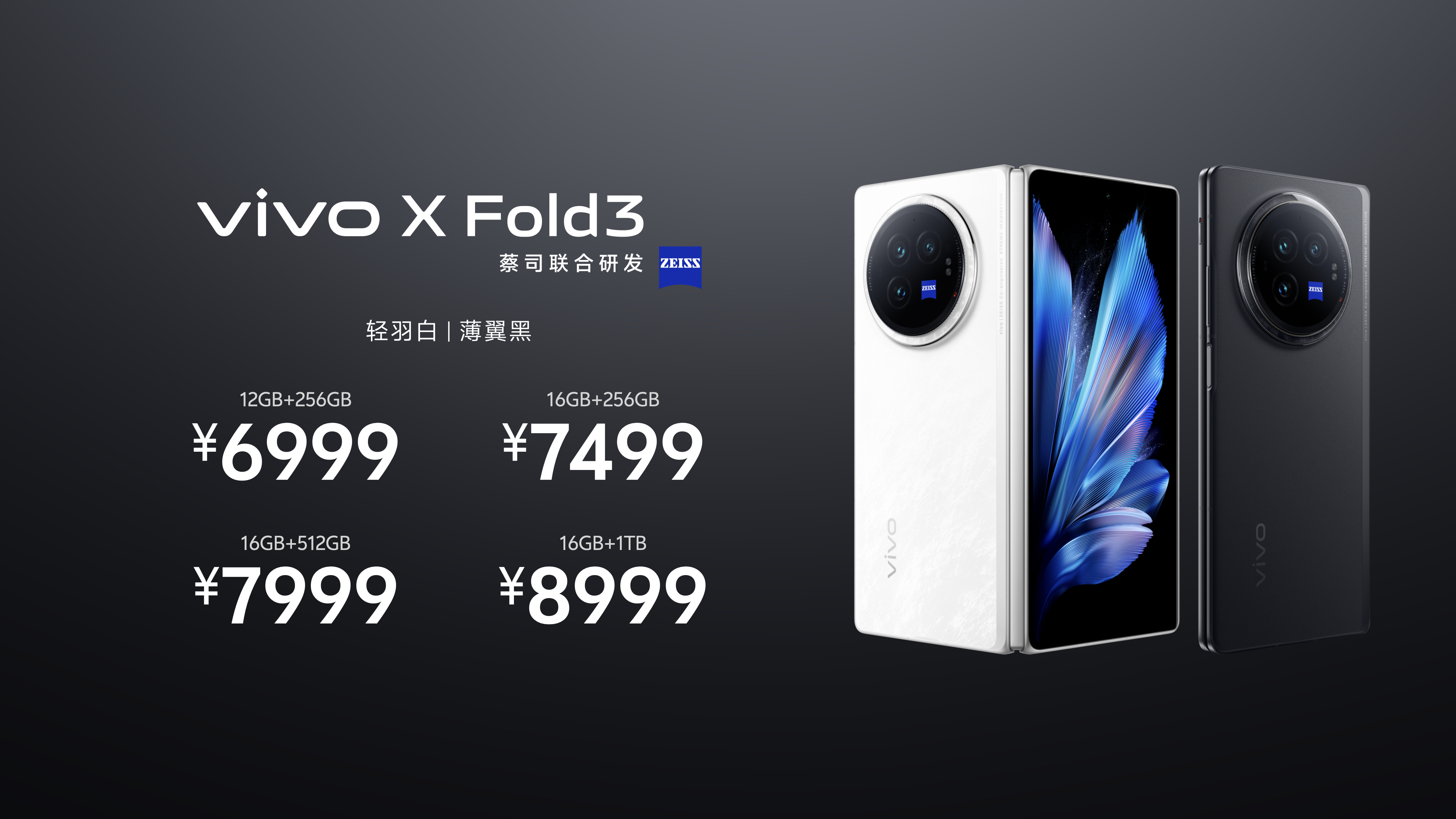本次发布的vivo X Fold3系列包含轻羽白、薄翼黑两种简约配色。X Fold3 Pro的价格为9999元(16GB+512GB)和10999元(16GB+1TB),与市售主流折叠屏机型持平;而X Fold3的价格则分别为6999元(12GB+256GB)、7499元(16GB+256GB)、7999元(16GB+512GB)和8999元(16GB+1TB),来到与主流直板旗舰相同的区间,让更多消费者可以享受到折叠屏带来的创新体验。