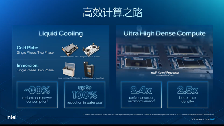 采用高能效的新一代产品也是一种有效的节能方法。英特尔中国可持续发展项目组负责人彭振飞介绍,采用英特尔最新的第五代至强可扩展处理器,通过选择电源优化模式就可以在30-40%工作负载时轻松实现110瓦的能耗降低。英特尔即将正式发布的至强6在能效上表现更为优秀,至强6 Sierra Forest首次采用纯能效核(E核)设计,可以带来2.4倍的能效提升,机架密度则可以提高2.7倍。这意味着在相同的空间里能提供更高的算力,并且是更高能效的算力。