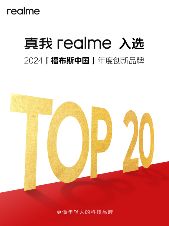 4月17日,福布斯中国正式发布了2024中国品牌价值系列评选结果,智能手机品牌真我realme凭借稳健的经营、出色的创新力和产品表现入选“年度创新品牌TOP 20”。