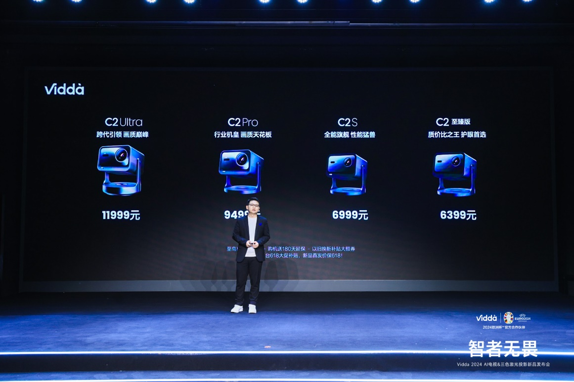 5月8日,智者无畏-Vidda 2024 AI电视&三色激光投影新品发布会在北京召开,海信旗下年轻科技潮牌Vidda正式发布三色激光投影C2系列。作为2024欧洲杯官方指定智能投影,本次亮相的Vidda C2系列四款新品集高亮度、高画质和健康护眼于一身。其中,跨代引领画质巅峰C2 Ultra和同代机皇C2 Ultra配备了行业首创的0.9~1.5:1超广投射比超级光学变焦镜头,实测亮度高达3000流明和2600流明,首发价格分别为11999元和9499元;全能旗舰C2S和质价比之王C2至臻版同样带来了2000流明和1700流明的同价位超高实测亮度,首发价格分别为6999元和6399元。作为智能投影行业今年首次发布的旗舰顶配,三色激光投影也将成为今年最值得期待的投影显示技术,带动三色激光的普及和行业跟进。