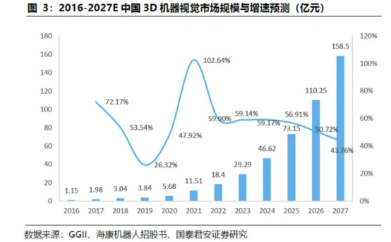 根据权威市场研究机构-高工产业研究院(GGI)数据显示,2023年中国3D视觉机器市场规模为29.29亿元,预计到2027年将增长至158.5亿元,年均增长率高达52.83%。