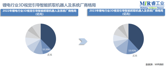 据权威市场研究机构MIR睿工业发布的报告,在锂电市场,3D视觉引导智能抓取机器人的市场规模也在迅速扩大。灵西机器人凭借卓越的技术和优质的产品,在国内引导类3D视觉锂电行业的市场占有率逐年攀升。从2022年的10.2%升至2023年的13.92%,这一显著成绩充分证明了灵西机器人在细分锂电市场行业中的领导地位。