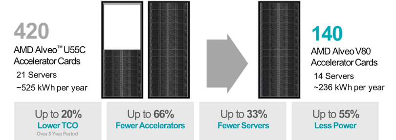 图 3:AMD Alveo V80 加速卡实现的预估传感器处理和 TCO 节省②(参见尾注 ALV-16②)