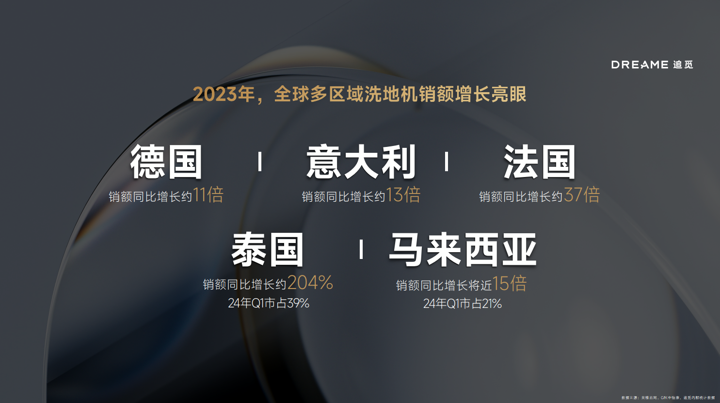 发布会上,追觅科技洗地机BG负责人胡膑表示,2023年,追觅科技洗地机产品全球销量已超过140万台,同比增长超过100%。其中在欧洲市场、东南亚市场、北美市场,销售额分别同比增长930%、420%、363%;而在泰国、马来西亚等市场,不仅销售额同比增长迅猛,至2024年Q1,市占率也已位列当地第一。