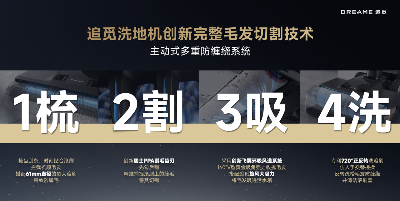 基于此,此次发布会上,追觅科技先后推出了多项行业首创技术。例如,毛发缠绕始终是困扰用户家庭清洁的最大痛点之一,为此追觅科技推出了主动式0缠毛技术,通过恒压梳齿,搭配追觅首创瑞士PPA割毛齿刃技术,在“一梳、二割、三吸、四洗”四重措施的加持下,真正实现清洁0缠绕,即使50cm长的头发也能轻松吸入,真正做到“免维护”。