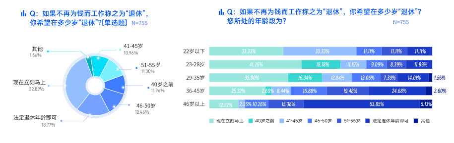 近日,脉脉高聘发布《2024春招高薪职业和人才洞察》(以下简称《洞察》)。《洞察》显示,32.89%的职场人希望能立即退休,而且年龄越小,选择“现在立刻马上”退休的人群占比越高,反映出越年轻越不想上班的职场情绪。超3成职场人期待“马上退休” 开展副业和找高薪工作成优选