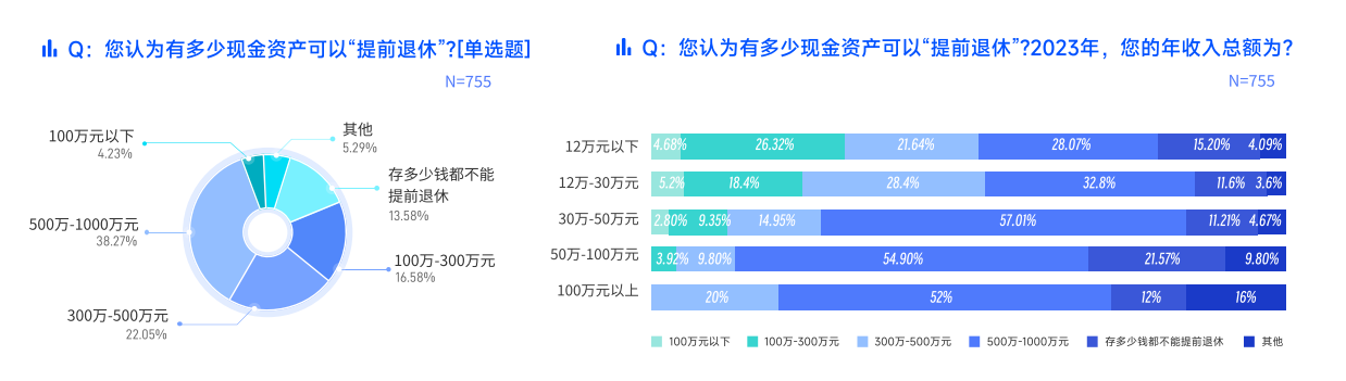 从提前退休的存款预期来看,38.27%的职场人认为存够500万才可以退休,也有13.58%的职场人认为存多少钱都不能提前退休。收入水平对退休存款预期有明显影响。年收入30万元成为分界线,30万以上收入的人群中,退休储蓄预期在最高区间500-1000万的人群占比超过50%。而30万以下收入的人群中,此项占比均少于33%。