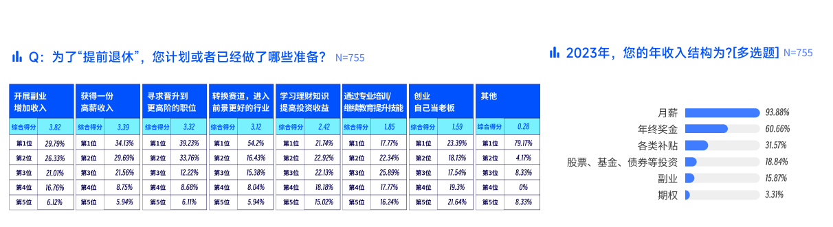 为实现“提前退休”,职场人采取了不同的措施。开展副业成为职场人实现提前退休的首要途径,在调研中,该项得分为3.82分,其次是“获得高薪收入”,得分3.39分。虽然“开展副业”受到青睐,根据调研实际上只有15.87%的职场人从副业获得收入。93.88%的职场人以固定月薪为主要收入来源。