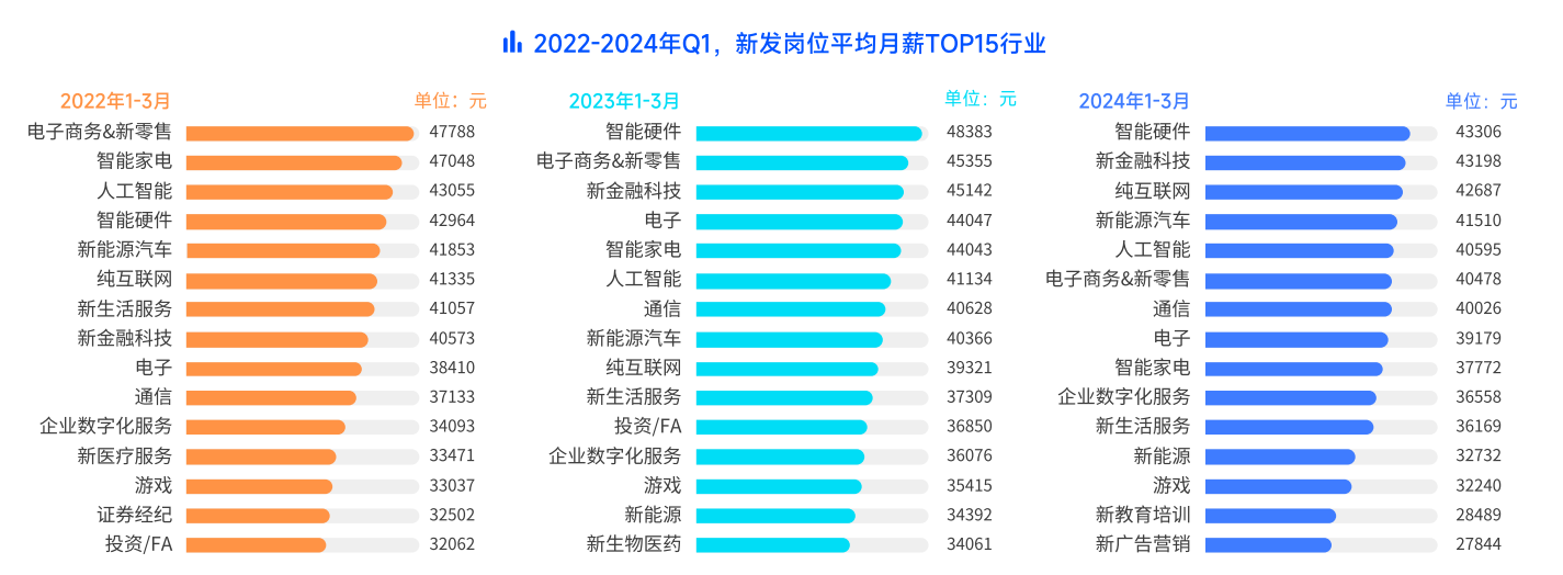从行业来看,2024年第一季度,智能硬件行业以43306元的新发岗位平均月薪蝉联高薪行业榜TOP1。纯互联网行业在经历了2023年的薪资排名的下降后,在2024年迎来回升,以42687元平均月薪位列第三。新能源汽车行业的平均月薪也有所增长,从2023年第一季度的40366元攀升至2024年第一季度的41510元,排名从第八上升至第四。