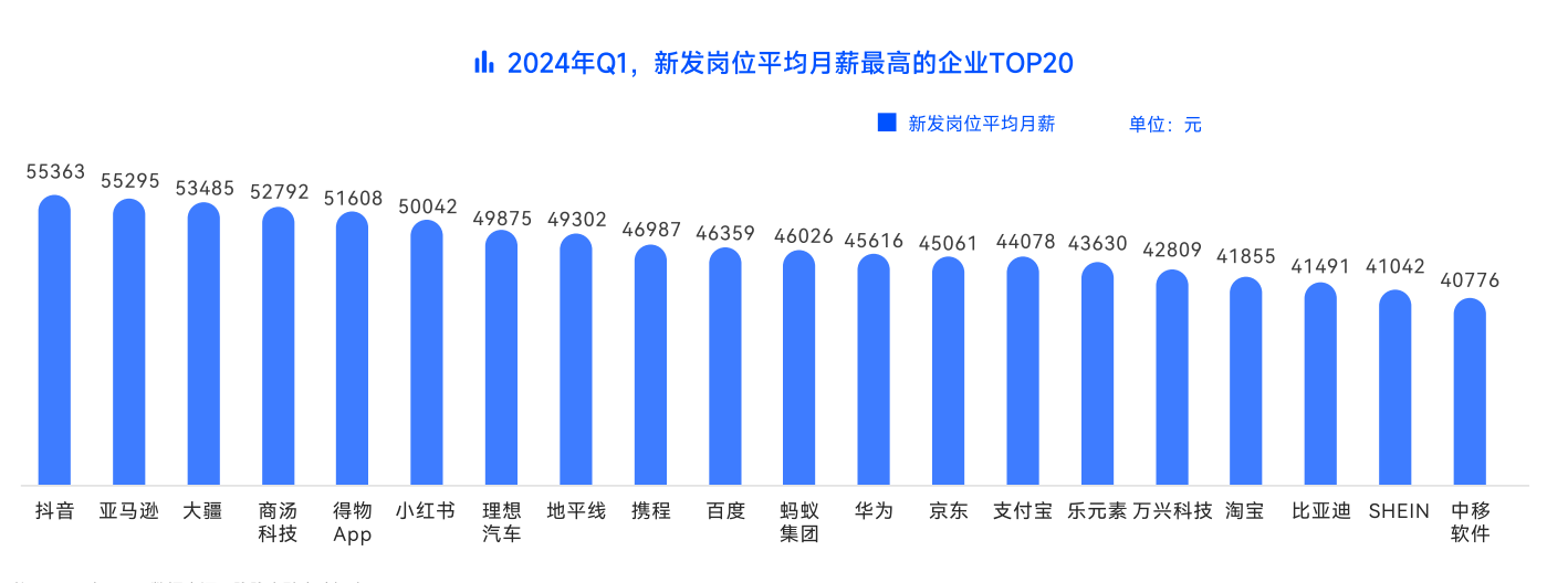从高薪企业来看,在2024年第一季度新发岗位平均月薪最高的20个公司中,抖音以55363元位居高薪榜第一,其次是亚马逊55295元,大疆、商汤科技、比亚迪、SHEIN等企业均位于TOP20。2024年第一季度新发岗位平均月薪超过4万元的企业中,AI四小龙之一的商汤科技新发岗位平均月薪涨幅12799元,位列涨幅榜第一,其次是AIGC领域上市企业万兴科技,涨幅11826元。随着电商行业的国际化加快,亚马逊、SHEIN等跨国电商企业的薪资水平也有所提升。