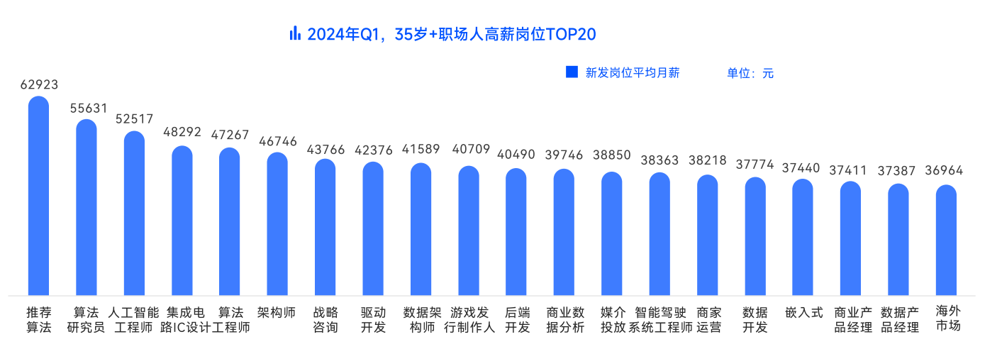 在35岁以上的职场人中,从事推荐算法工作的人才平均月薪最高,达到了62923元,远远领先于其他工种。技术研发类岗位占据了35岁以上高薪岗位TOP20榜的12席。上榜的8个非技术研发岗位依次是战略咨询、游戏发行制作人、商业数据分析、媒介投放、商家运营、商业产品经理、数据产品经理、海外市场。