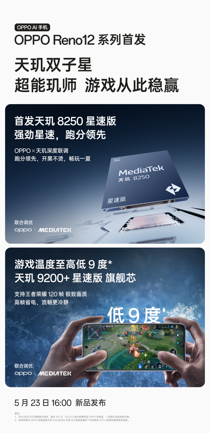 OPPO Reno12 系列首发搭载天玑 8250 星速版与天玑 9200+ 星速版芯片,不仅跑分出色,更新支持星速引擎,能够为 OPPO 用户大幅度降低游戏满帧运行的发热,提升手机的续航时间。在以 120 帧极致画质运行王者荣耀时,Reno12系列的温度至高比其他产品低 9 度。