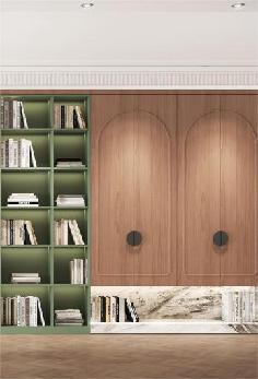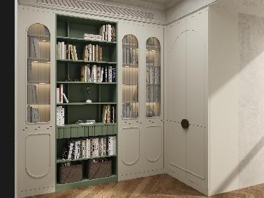 杂物间变书房,靠墙一体式书柜,采用白绿清新调,与长虹玻璃结合设计,增添复古氛围感,这就是梦寐以求的,家庭图书室呀。