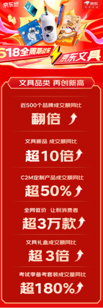 凭借“又便宜又好”的消费体验,今年京东618充分激发了消费者的购物热情。京东文具以始终如一的高品质、高性价比获得消费者高度认可,截至6月18日23:59,超500个品牌成交额同比翻倍,新品文具成交额同比增长超10倍,文具礼盒成交额同比超3倍。618期间正逢一年一度高考季,考试季备考套装成交量同比增长超180%。