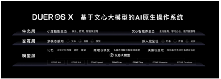 两个月前百度2024Create大会上,小度正式宣布升级DuerOS X操作系统,同样基于百度文心大模型,也是全球首个AI原生的操作系统。包含三大层架构:模型层、交互层和生态层。