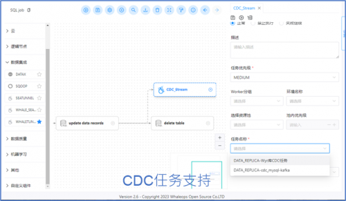 现在越来越多的用户开始使用实时数据仓库,从数据CDC抽取到数据实时加工及展示,从而支持风控、经济业务、银行在线分析等实时场景。在2.6版本中,我们还新增了对多种实时任务的全面支持,用户可以更便捷地进行编辑、管理、控制和删除操作,全面升级用户实时数据仓库开发能力。这些实时任务包括:
