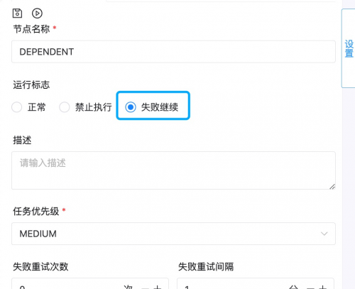 弱依赖模式:为了提高任务调度的灵活性,我们新增了任务组件的运行标志“失败继续”的弱依赖模式。在这种模式下,当前任务节点执行失败(例如等待1小时还为满足要求,而失败)不会阻断当前流程,后续任务将正常提交执行。