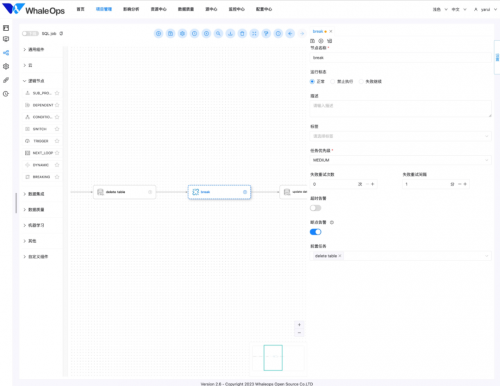 新增了BREAK逻辑任务节点。该节点允许在执行到此节点时自动暂停流程并发送告警通知,从而让用户可以手工参与到工作流的安排中。这一功能使得工作流调度更加灵活,并能够及时响应和处理异常情况。