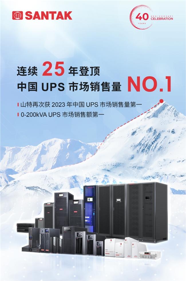 近日,国内权威机构赛迪顾问(CCID)发布了《2023-2024 年中国 UPS 市场研究年度报告》。报告显示,2023 年,山特在中国 UPS 市场销售量和 0-200kVA UPS 市场销售额均排名第一,山特以 40 年匠心品质、品牌实力再次登顶行业巅峰。截止目前,山特已 25 年稳居中国 UPS 市场销售量第一,辉煌佳绩持续领跑行业。