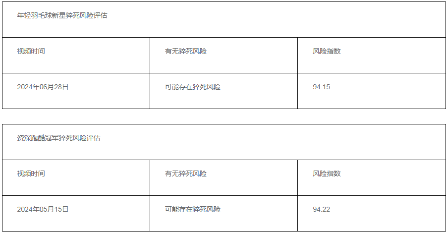 下表是我司利用年轻羽毛球新星(17岁)与资深跑酷冠军(39岁)公开视频资料进行监测分析的数据。数据显示年轻羽毛球新星在赛前有心源性猝死风险,资深跑酷冠军在2024年5月15日有心源性猝死风险,近期不适宜做高强度运动或者需要干预化解猝死风险。