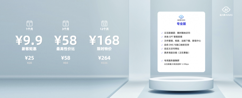 新品首发期间,为了让更多用户体验到鲁大师 AiNAS的完整服务,即日起首发新用户可以享受鲁大师 AiNAS「专业版」首月9块9、年卡168元的特惠价格。欢迎大家前往鲁大师 AiNAS官网下载体验。