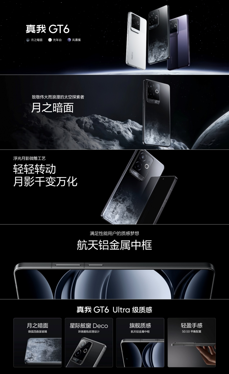 质感设计方面,真我GT6延续了对科技美学的极致探索,带来真我GT6月球探索版。全新的“月之暗面”设计采用浮光月影微雕工艺,在手机上完美雕刻出月球表面独特的纹理,在不同光影角度下呈现出不同的月影变化。此外,真我GT6从太空探索美学获取灵感,带来光年白和风暴紫两款配色。