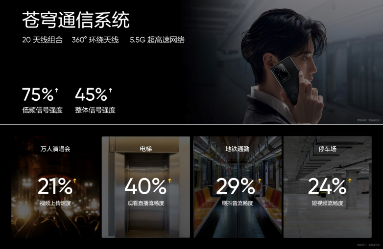 真我GT6首发苍穹通信系统,挑战行业最强信号。苍穹通信系统包括20天线组合、360°环绕天线,充分覆盖核心信号频段,并且升级最新5.5G超高速网络,网速效果提升显著,无论是万人演唱会,还是地铁、停车场、电梯等弱信号场景都能从容应对。