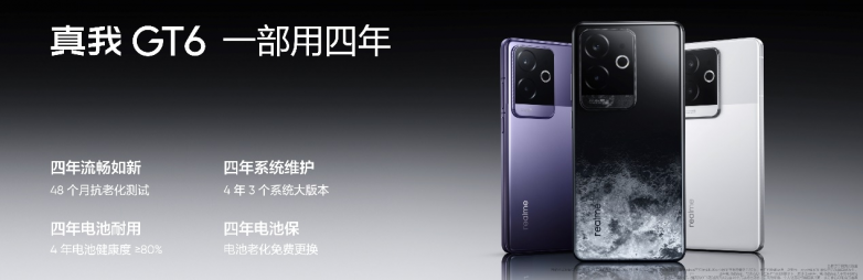 真我GT6目标为用户打造一部用四年的耐用体验。为此,真我GT6通过48个月抗老化测试,四年流畅如新;全新聚能电池,电池4年耐用,首销用户更能获赠4年电池保。此外,真我GT6还承诺4年3个版本的更新计划,让真我GT6真正成为一部用四年的耐用神机。