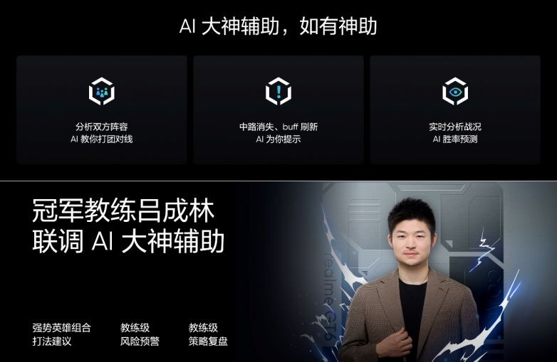 真我GT6带来行业首款电竞黑科技——AI大神辅助。AI大神辅助将实时分析游戏对局进展,为玩家提供对线技巧、胜率预测、风险提醒、策略引导等四大辅助。此外,真我GT6还邀请电竞冠军教练吕成林联调AI大神辅助,为玩家提供教练级的游戏指导。