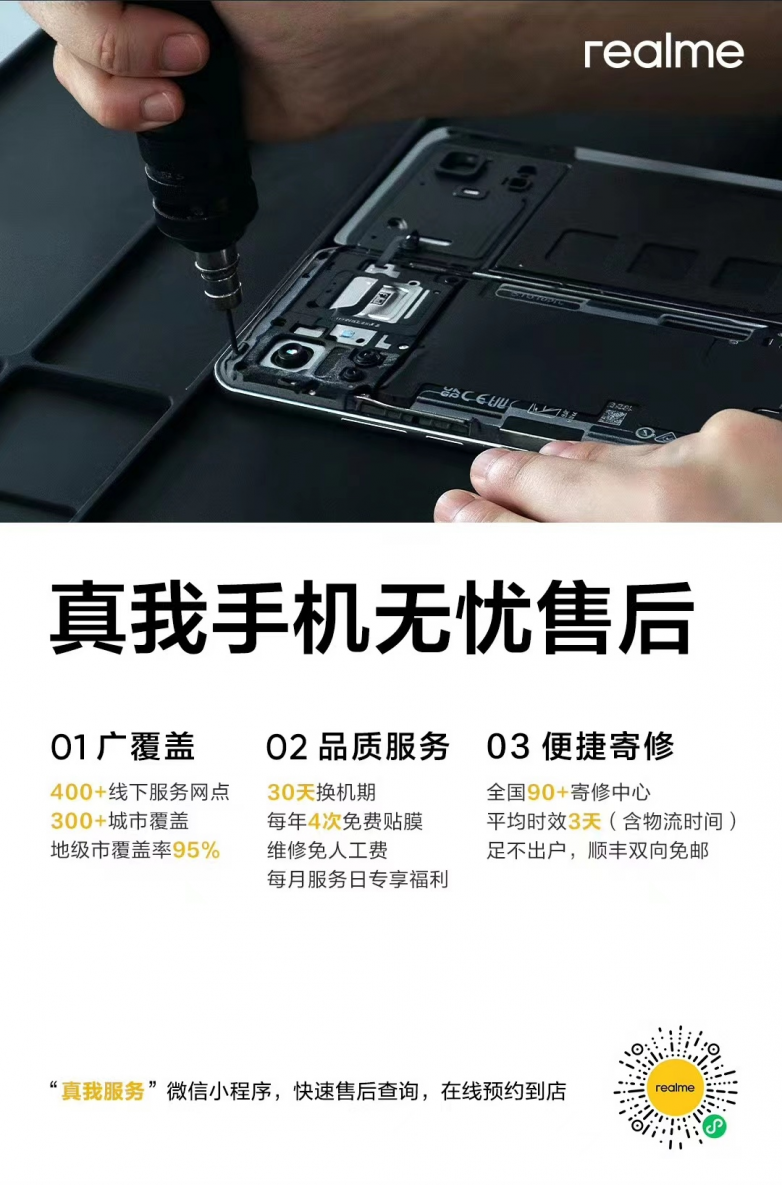 真我售后服务持续全面升级,目前已覆盖95%的地级市,共开设了400+服务门店。同时,真我还提供便捷寄修服务,含物流平均维修时长仅需3天,双向寄修服务均为免邮,让用户寄修手机更便捷省心。“真我服务”微信小程序已全新上线,欢迎用户搜索关注。