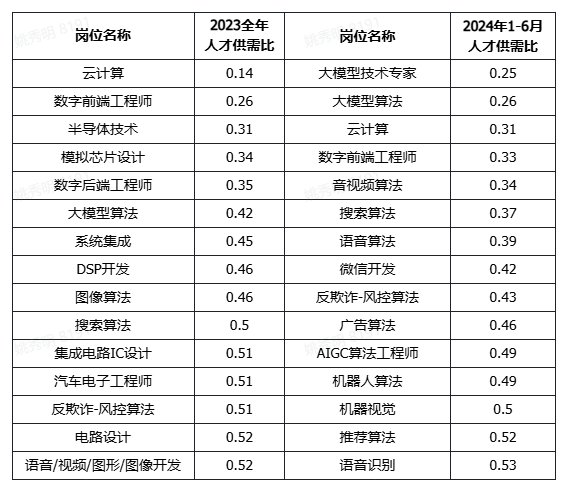 林凡认为,大模型行业不存在“抢人”情况。首先,大模型公司更愿意把更多的资金投入到算力上,而不是人力上。其次,大模型公司实际需要的人才规模比移动互联网时代大幅降低,基座大模型公司员工仅有数百人左右。最后,大模型企业缺的是高技术人才,对人才的能力门槛要求更高。根据脉脉高聘人才智库数据,在人工智能领域,大模型算法、搜索算法、云计算、数字前端工程师、反欺诈-风控算法等技术人才,连续两年供不应求,而且岗位名称逐渐细分。在2024年1-6月的人才紧缺度TOP15岗位中,音视频算法、语音算法、大模型算法、机器人算法均为新上榜的岗位。