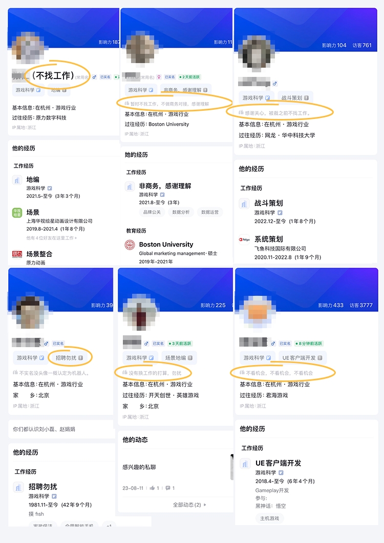 平台认证为游戏科学公司员工的脉脉用户主页显示,标注“不找工作”等信息的岗位分布在战斗策划、UE客户端开发、场景、地编、关卡策划等多个岗位。据媒体报道,游戏科学公司员工数量不超过150个人。而根据脉脉平台数据,目前共有39名游戏科学员工活跃在脉脉,超过总员工数量的1/4。