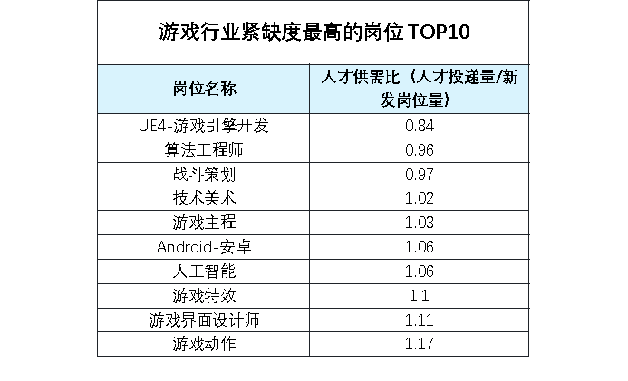 脉脉高聘人才智库数据显示,2024年1-7月,腾讯、网易、米哈游、莉莉丝、盛大网络等头部游戏公司均在脉脉招聘人才,其中盛大网络新发岗位平均月薪最高,为79583元。在新发岗位中,人才最紧缺的前三分别是:UE4-游戏引擎开发,人才供需比仅为0.84,其次为算法工程师和战斗策划,这三个岗位的人才供需比均小于1,人才供不应求。