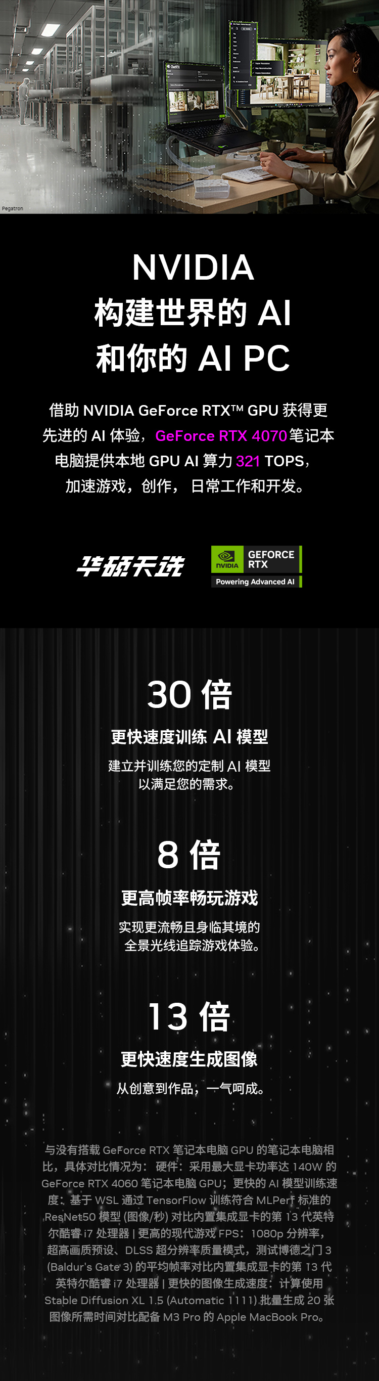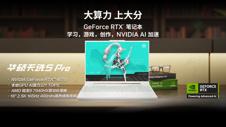 在这个快节奏的时代,拥有一台能实现高效创作的个人电脑至关重要,NVIDIA GeForce RTX™ 和 NVIDIA RTX™ GPU 专为 AI 时代打造。RTX GPU 由业界领先的 NVIDIA GPU 架构提供强劲支持,并搭载专用的 AI Tensor Core,GeForce RTX 40系列笔记本电脑提供强大本地GPU AI 算力,加速游戏、创作、日常工作和开发的AI体验。经 RTX 加速的 AI 应用和游戏,已超过 500 款。无论是现在还是未来,您都可以在 RTX AI PC 上充分发挥 AI 潜力。而搭载NVIDIA® GeForce RTX™ 40 系列笔记本电脑GPU的华硕天选5 Pro锐龙版与华硕天选5就值得各位用户关注。