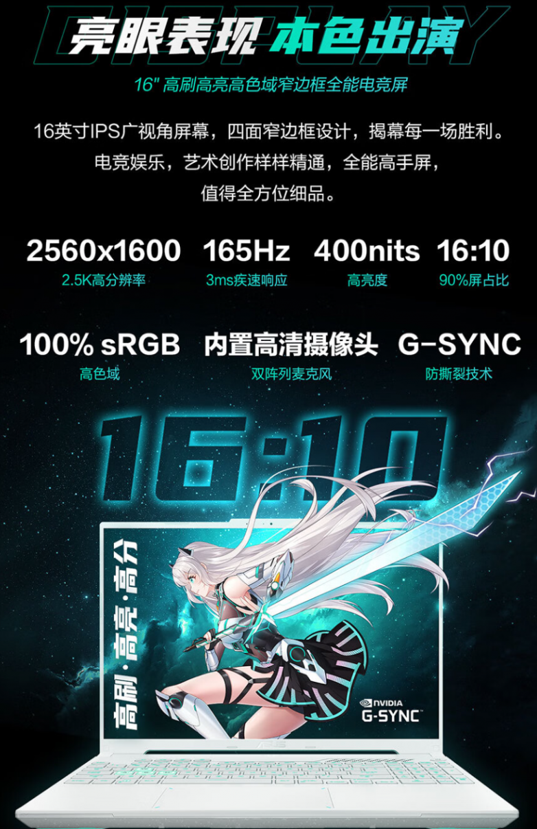 屏幕则为16英寸高刷高亮高色域窄边框电竞屏,采用16比10黄金比例,屏占比高达90%,观感沉浸。并拥有2.5K分辨率,165Hz刷新率,屏幕响应速度低至3ms,支持G-SYNC防撕裂技术,可呈现高清画面,酣畅激战驰骋电竞疆场。其他方面,屏幕支持最高400nits亮度,100% sRGB色域覆盖,内置高清摄像头与双阵列麦克风,可满足日常创作、学习、娱乐等多方面需求。