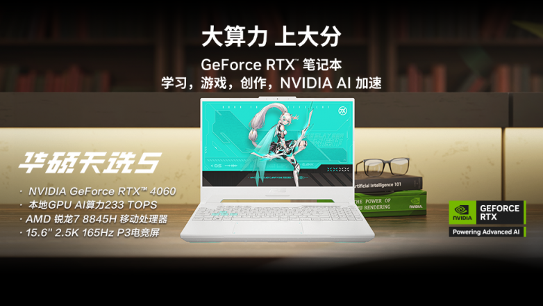华硕天选5同样拥有优异性能,其处理器采用AMD锐龙7 8845H,8核16线程,单核MAX主频5.1GHz,支持AMD RYZEN AI,可加速本地AI应用,畅享高效率创作体验。GPU方面,搭载满功耗NVIDIA® GeForce RTX™ 4060笔记本电脑GPU,可提供至高233 TOPS本地GPU AI算力。借助其内置的第 4 代 Tensor Core 与第 3 代 RT Core,配合NVIDIA DLSS 3技术与全景光线追踪技术,可在不影响画质和响应速度的前提下利用 AI 创造更多高质量帧,缔造栩栩如生的虚拟世界。