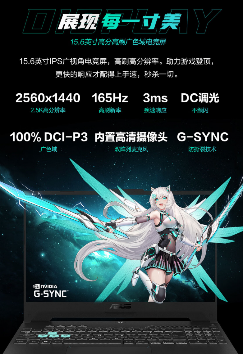 屏幕方面,华硕天选5搭载15.6英寸高分高刷广色域电竞屏,2.5K分辨率,165Hz刷新率,3ms疾速响应,支持G-SYNC技术,100% DCI-P3广色域覆盖,可呈现精致细腻的画面,为娱乐、创作添彩助力。还有DC调光技术的加持,呵护用户的视力健康。