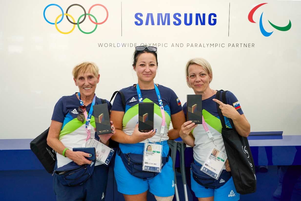 ▲ 来自斯洛文尼亚的坐式排球运动员在残奥村的三星体验区领取三星 Galaxy Z Flip6 奥运版后合影留念。