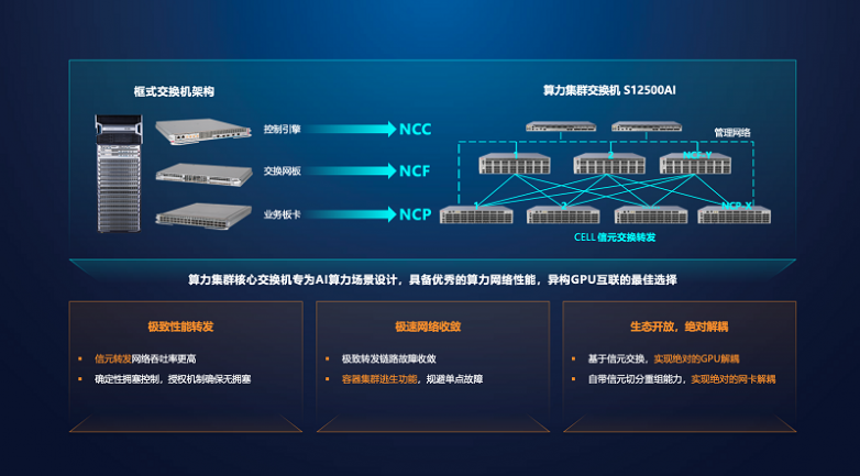●保留信元交换的底层机制,实现100%无阻塞能力,并且摆脱了框式设备的端口限制,最大可以支持32K GPU集群组网,同时规避了单框功耗过大的部署风险;