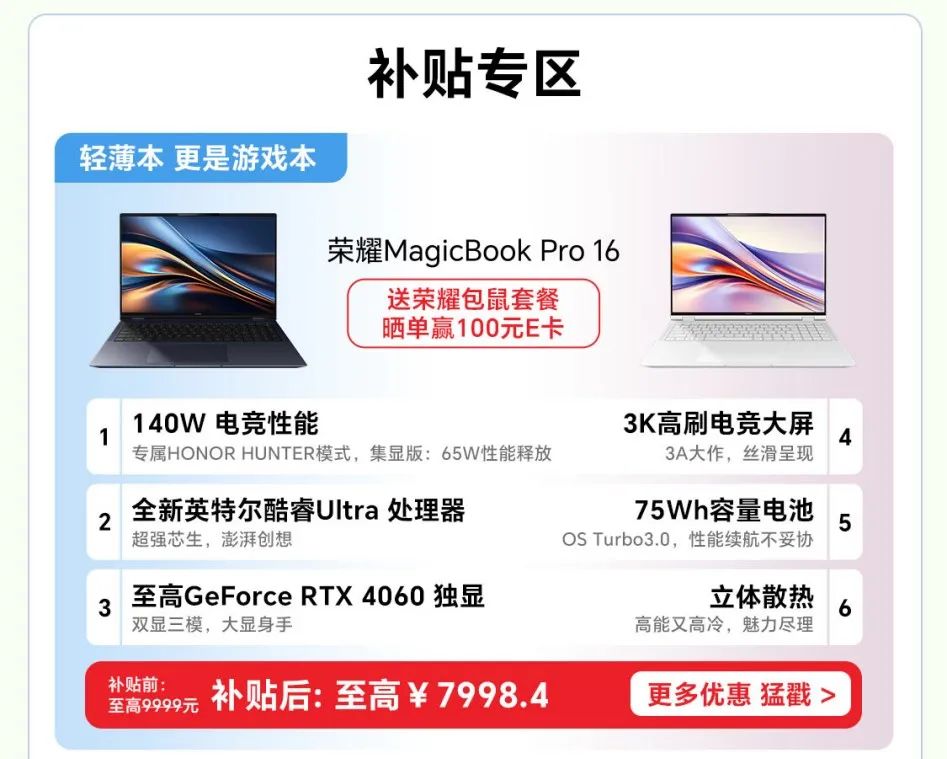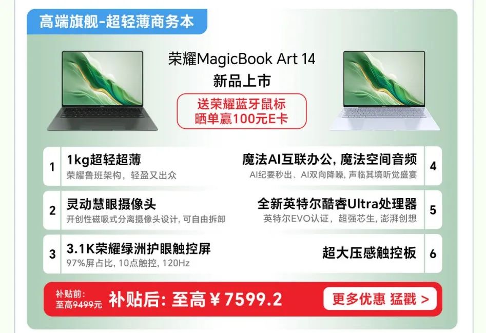 原价7799元的荣耀MagicBook Art 14,京东到手价6239元,原价9098元的独显版荣耀MagicBook Pro 16,京东到手价7238元。此次补贴覆盖了荣耀笔记本全品类,除了两款旗舰产品外,购买荣耀MagicBook X系列、荣耀笔记本X系列也可享受20%补贴优惠。