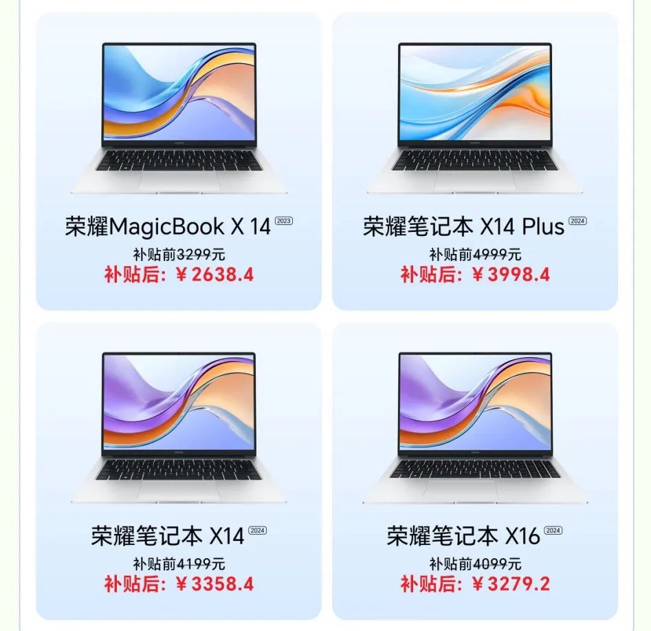 此外,购买荣耀MagicBook X系列、荣耀笔记本X系列产品也可享受20%补贴优惠,荣耀MagicBook X16战斗版到手价2399元,R7+32G+1TB版荣耀笔记本X14 Plus到手价3998元。
