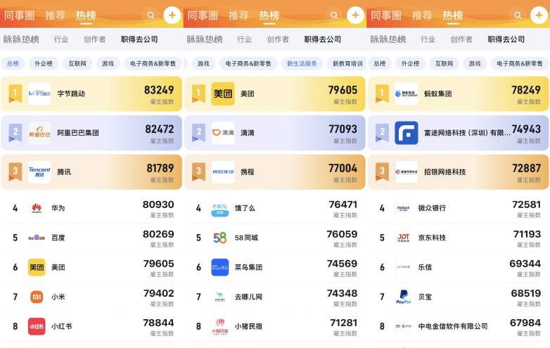 脉脉职得去公司榜上线 字节跳动位列总榜榜首