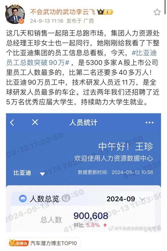 日前,比亚迪集团品牌及公关处总经理李云飞更是表示,比亚迪员工总人数已超过90万人,其中,技术研发人员近11万;比亚迪目前已经成为全球研发人员最多的车企。