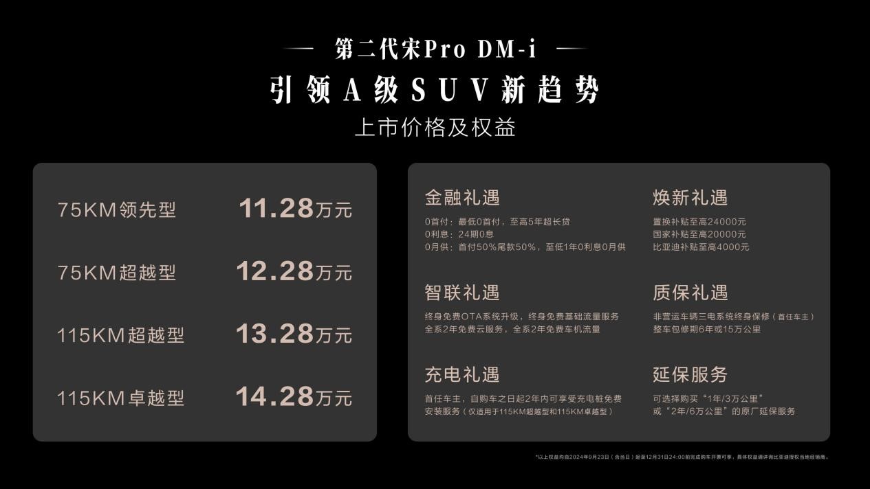 9月23日,A级SUV冠军全面进化,第二代宋Pro DM-i焕新上市,新车共推出4款车型,官方指导价11.28万元-14.28万元。新车搭载比亚迪第五代DM技术,百公里亏电油耗低至3.79L,创A级SUV新低,满油满电综合续航超1400km,以“大美智省值”的超强产品力引领A级SUV新趋势,成为主流务实家庭、年轻单身用户的购车首选。
