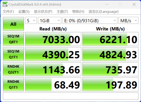默认设置下,朗科NV7000-t 1TB PCIe4.0 SSD持续读取速度达到7033MB/s,写入速度达到6221 MB/s,4K QD1随机读写速度分别达到68/197MB/s,这样的理论性能表现,处于一线PCIe 4.0 SSD性能水准。可见换主控之后,性能表现非常给力。